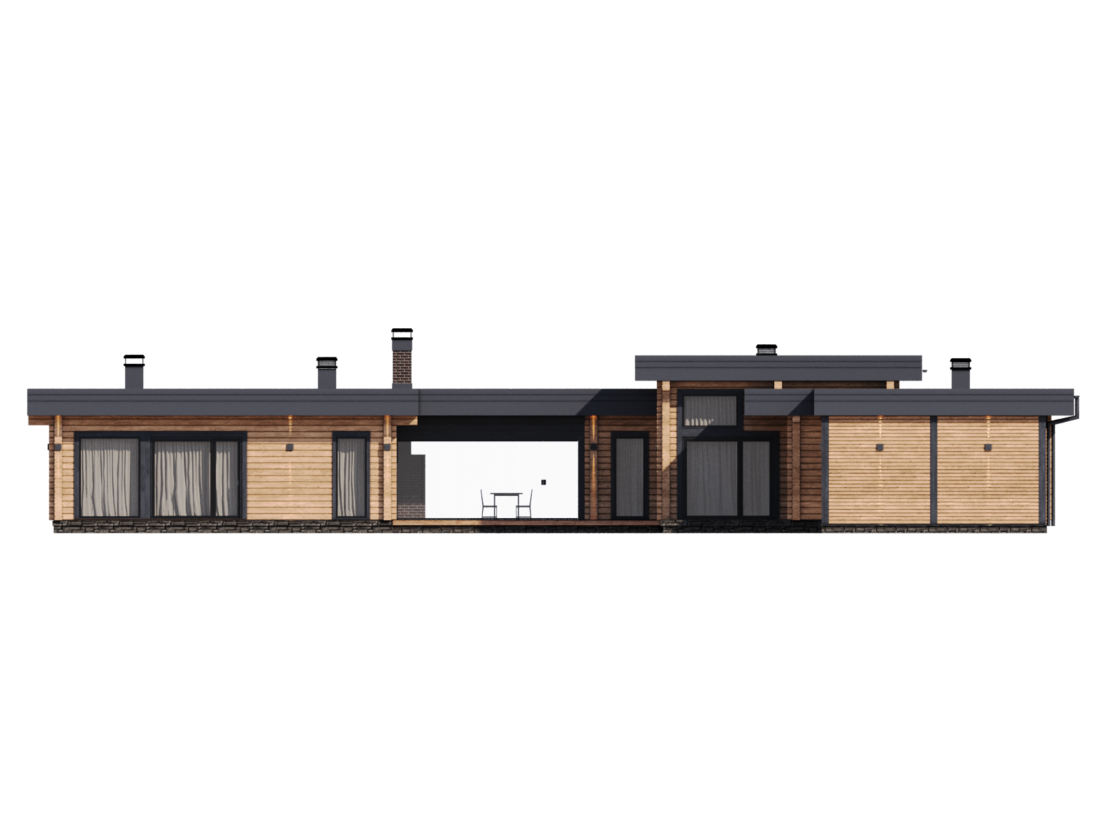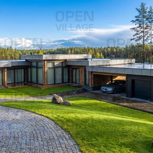 Архитектурные особенности: скандинавский минимализм: чистые линии, отсутствие декора, лаконичность форм, угловая Г-образная планировка: эффективно защищает внутренний двор от посторонних взглядов, и органично вписывает крупный комплекс в участок, панорамное остекление: стирает границу между интерьером и ландшафтом, окна наполняют дом светом и меняющимися картинами природы.