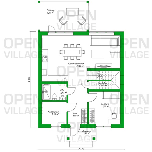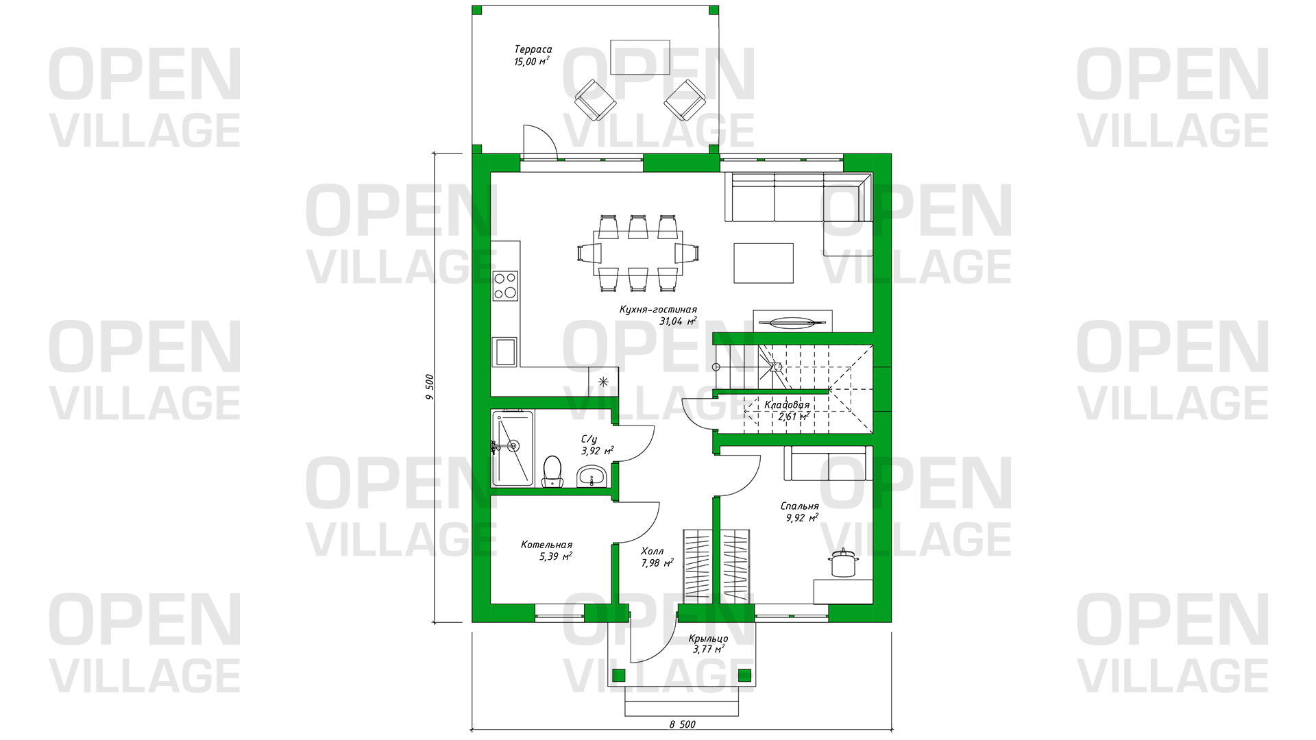 Общая площадь дома составляет 162 м². Первый этаж отведён под общее пространство и технические помещения. Просторная кухня-гостиная площадью 31 м² объединяет зону готовки, столовую и гостиную. Из неё предусмотрен выход на террасу площадью 15 м² — уютное место для летних ужинов и утреннего кофе. Рядом расположена гостевая спальня, которую можно использовать как кабинет. Здесь же находятся санузел, котельная и небольшая кладовая под лестницей — всё, что нужно для удобной организации быта.