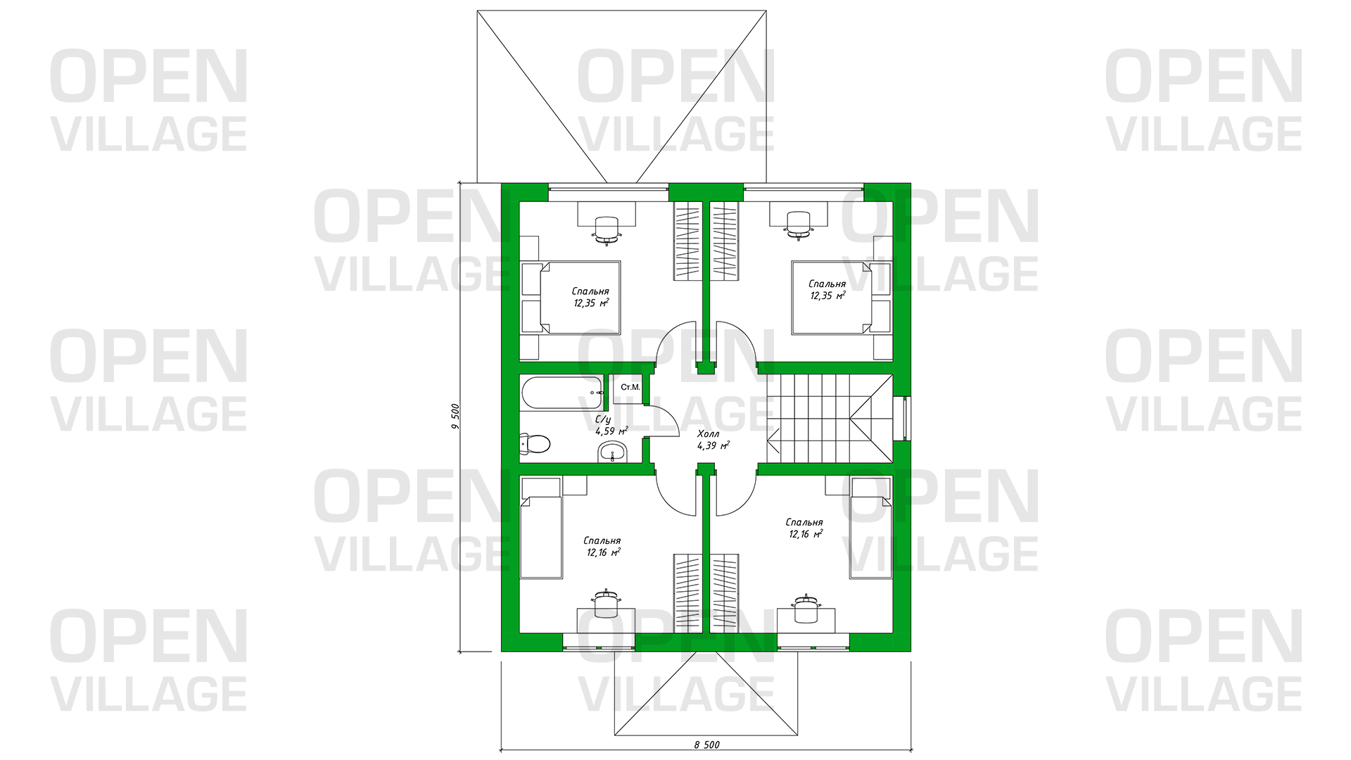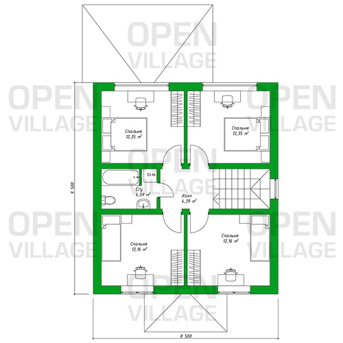 Второй этаж выполнен в формате мансарды, что придаёт дому особое настроение уюта. Наклонные потолки и высокие окна создают мягкое, тёплое пространство с живым светом. Здесь расположены четыре спальни площадью около 12 м² каждая — уютные, светлые комнаты, идеально подходящие для детей или гостей. На этаже также предусмотрен санузел и удобный холл, объединяющий жилые помещения.