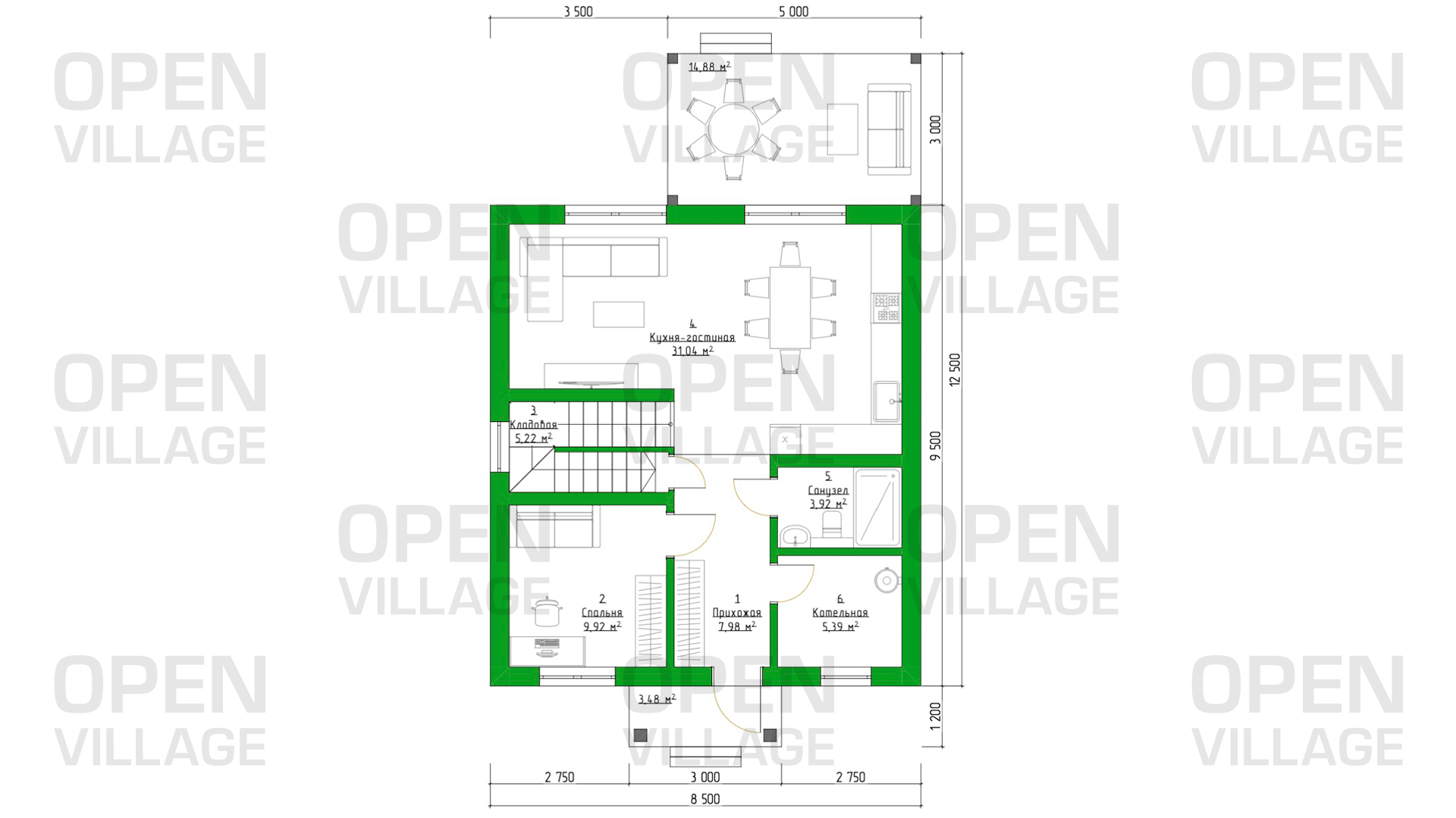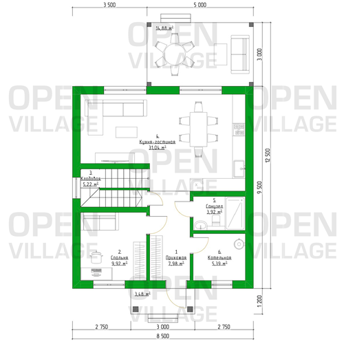 Первый этаж объединяет все помещения, отвечающие за активную часть жизни семьи. Центральное место занимает просторная кухня-гостиная площадью 31 м² — светлое и уютное пространство, где удобно готовить, принимать гостей и проводить время вместе. Из гостиной предусмотрен выход на террасу, а большие окна наполняют комнату естественным светом и открывают вид на участок. Рядом расположена спальня — универсальная комната, которая может стать кабинетом, гостевой или уютным местом для старшего поколения. В этой же зоне находятся санузел, котельная и кладовая под лестницей — всё необходимое для комфортного быта и поддержания порядка.