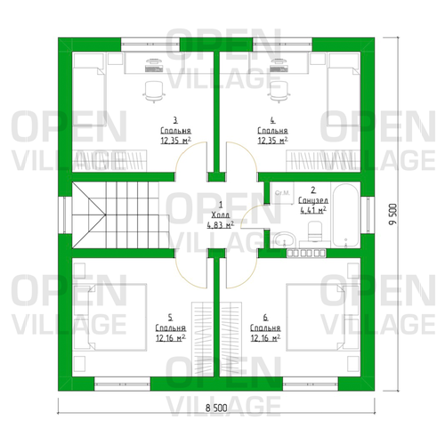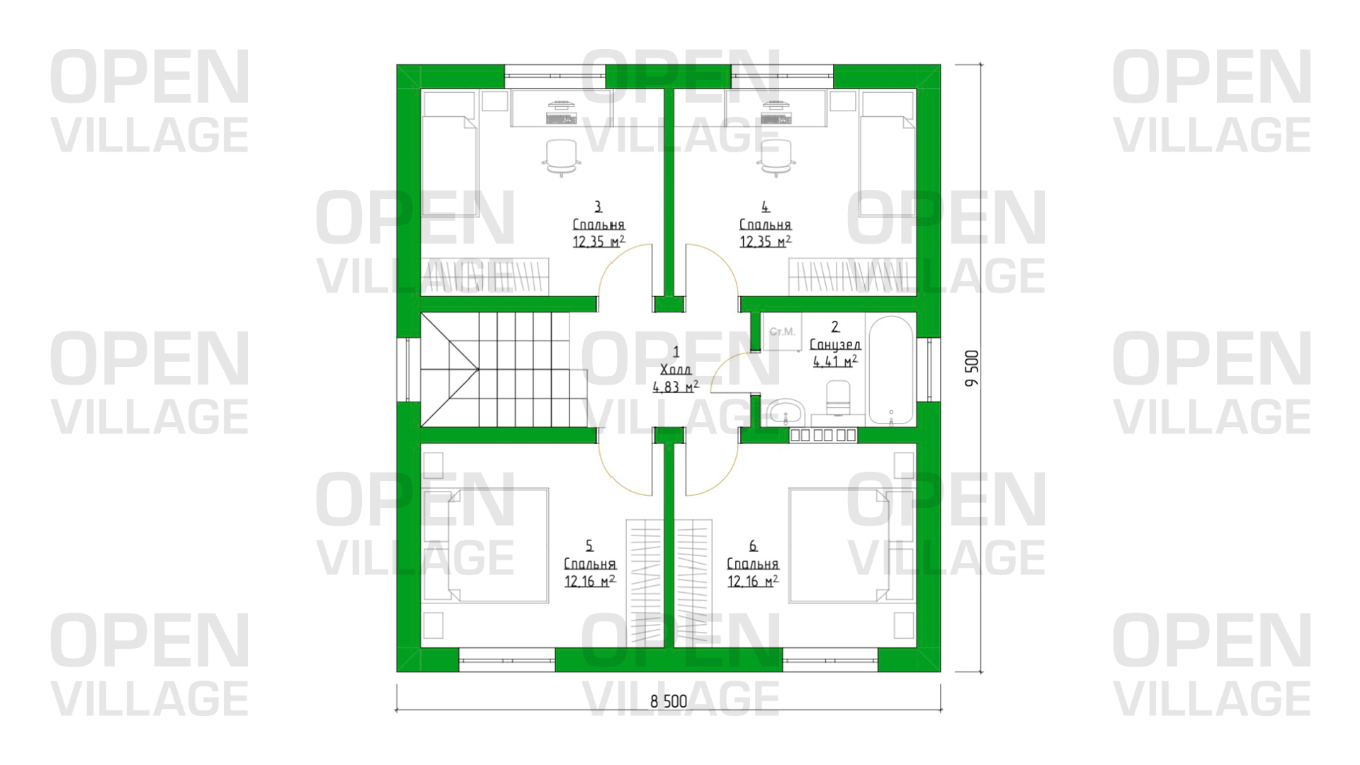 Полноценный второй этаж полностью отведён под жилую часть. Здесь расположены четыре спальни площадью от 12 до 13 м² — уютные, светлые комнаты с правильной геометрией, где каждый член семьи сможет обустроить своё личное пространство. Второй санузел делает утренние сборы удобными, а продуманное расположение комнат обеспечивает тишину и приватность. Просторный холл связывает все помещения, создавая ощущение целостности и уюта.
