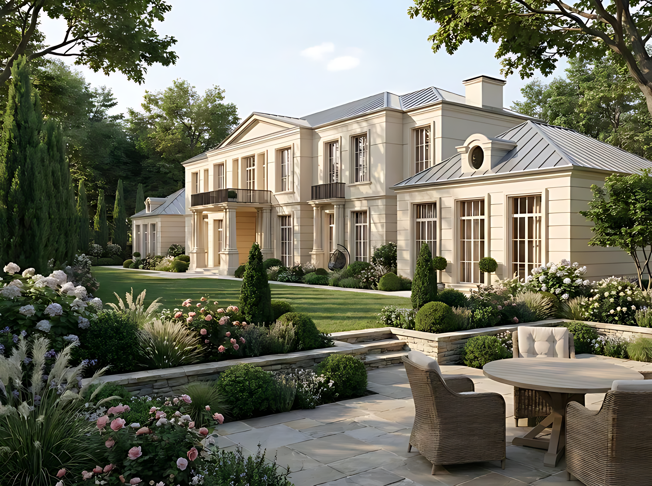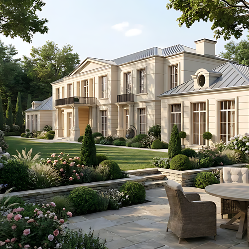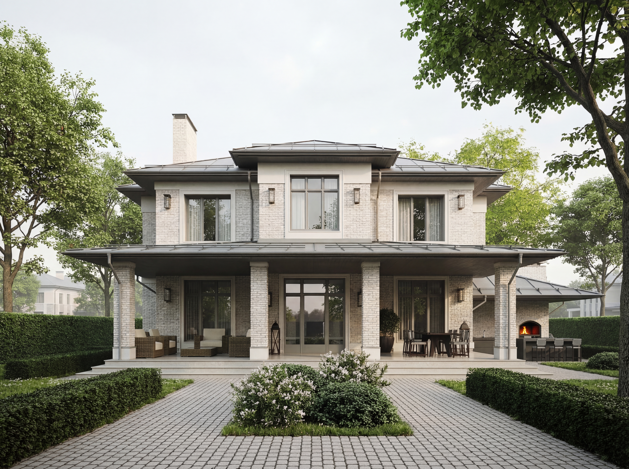 Двухэтажный дом с лаконичным и гармоничным обликом. Фасад выполнен из светлого кирпича. На первом уровне — просторная терраса с зоной отдыха и обеденной группой, а также уличный камин. Центральный вход выделен большими стеклянными дверями, по бокам — панорамные окна, наполняющие дом светом. Симметричная композиция фасада дополнена декоративными светильниками.