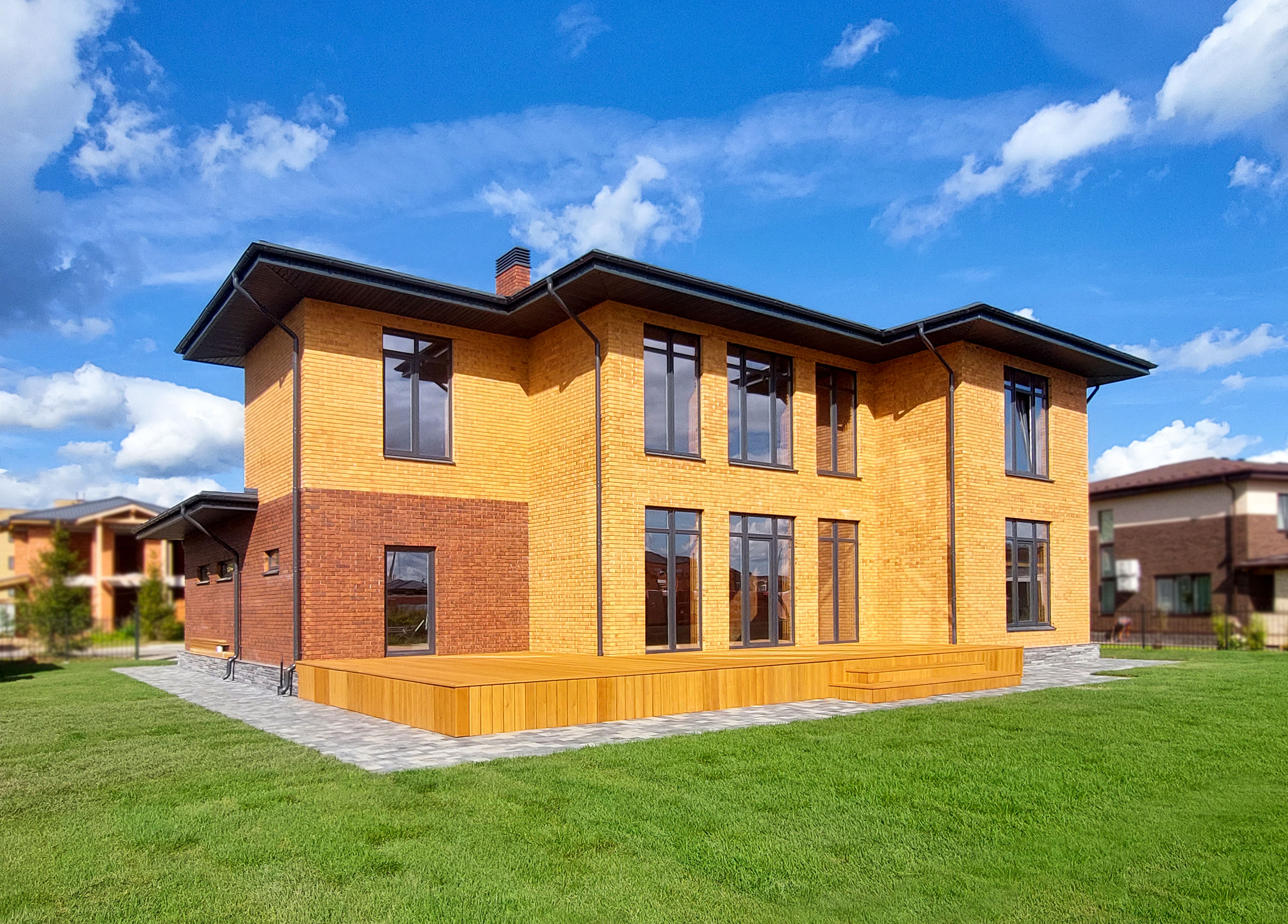 Умная планировка двухэтажного дома 214 м² по проекту «Фрэнк» в стиле "Райт" с панорамным остеклением и вторым светом – та эстетика, что будет развиваться вместе с вами.