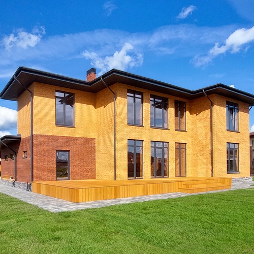 В доме по проекту «Смарт» строгая геометрия фасада в голландском стиле подчеркнута богатой фактурой дизайнерского кирпича.