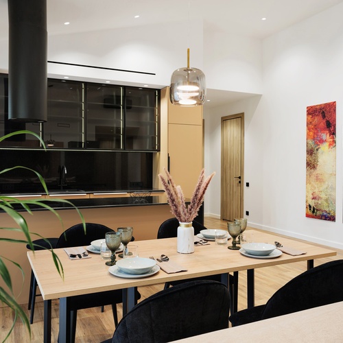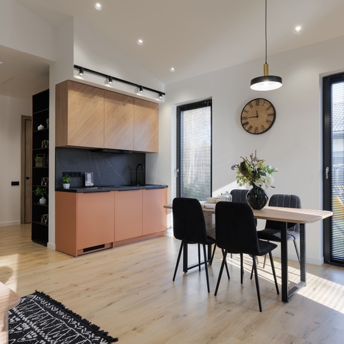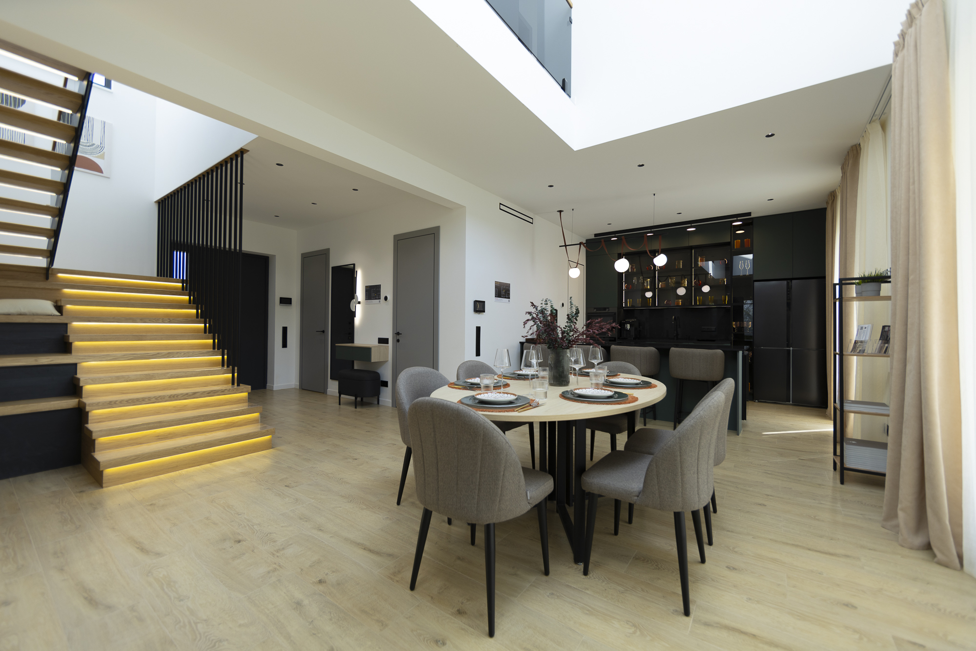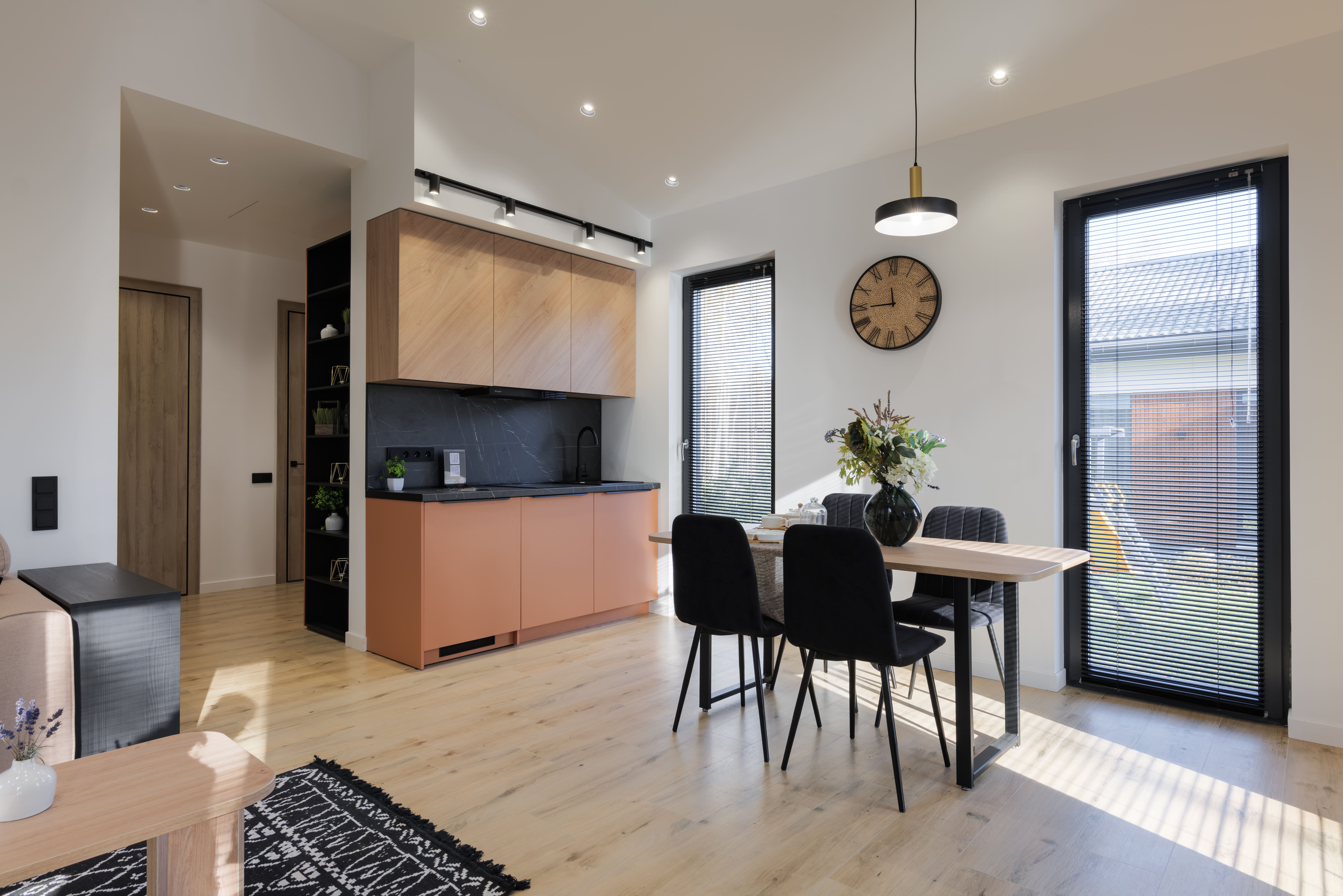 - В центре дома расположена просторная кухня‑гостиная — место, где можно собраться всей семьей для просмотра фильма.