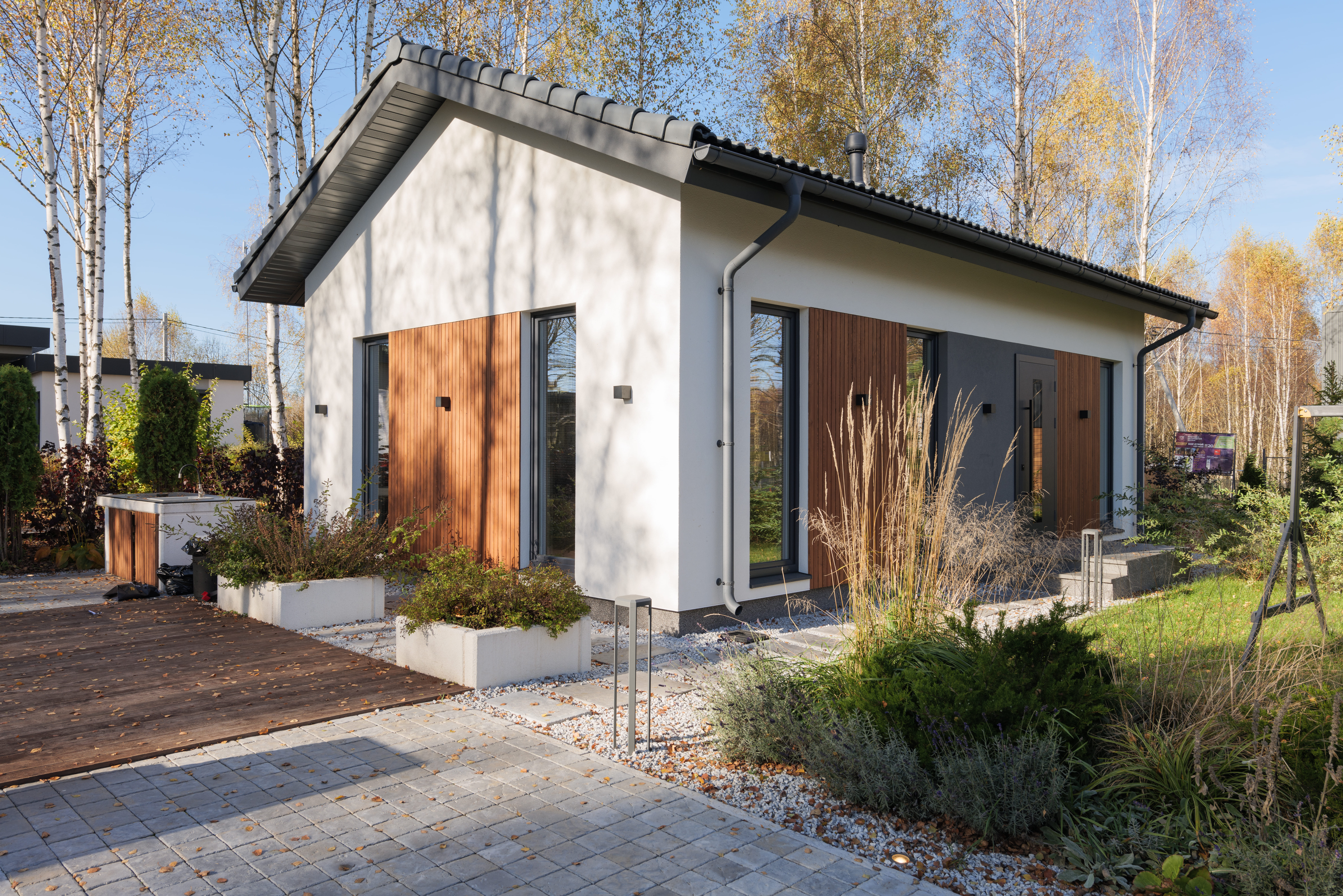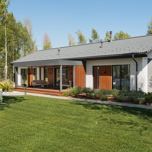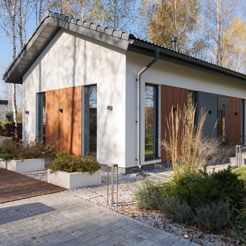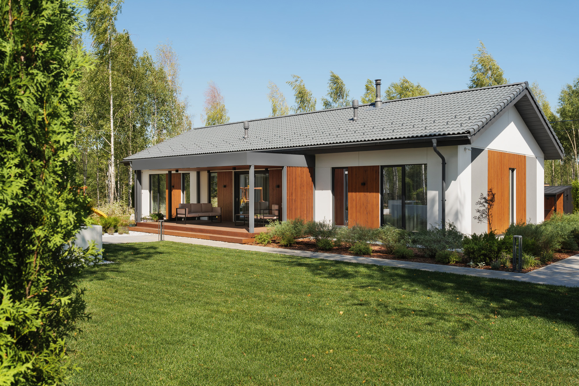 Проект ДСУ 50 — современный одноэтажный дом со светлым фасадом, который подчёркнут деревянными вставками из планкена.