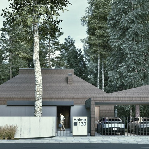 Дом для семьи из 4 человек в стиле минимализм. Сбалансированный дом для круглогодичного проживания с тремя спальнями. Кровля в форме луковицы дает много пространства и воздуха в зоне гостиной. Панорамное остекление. Стоимость указана за весь домокомплект с навесом на 2 авто и хозблоком в нем, навесом над входом и террасой.