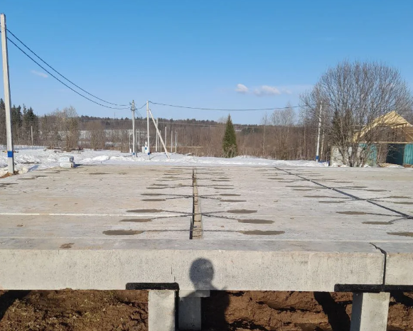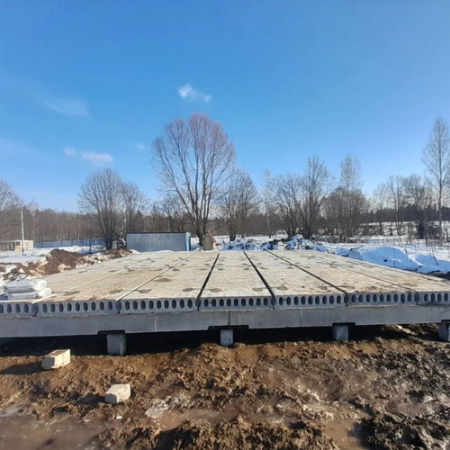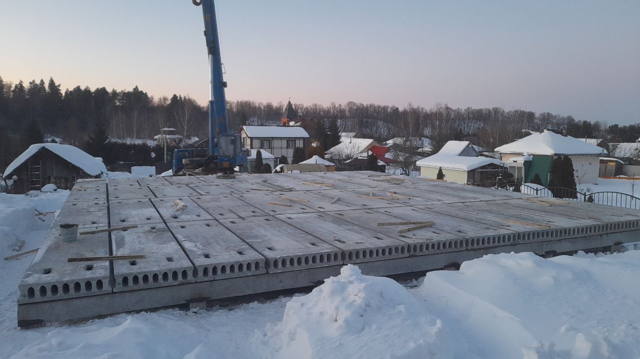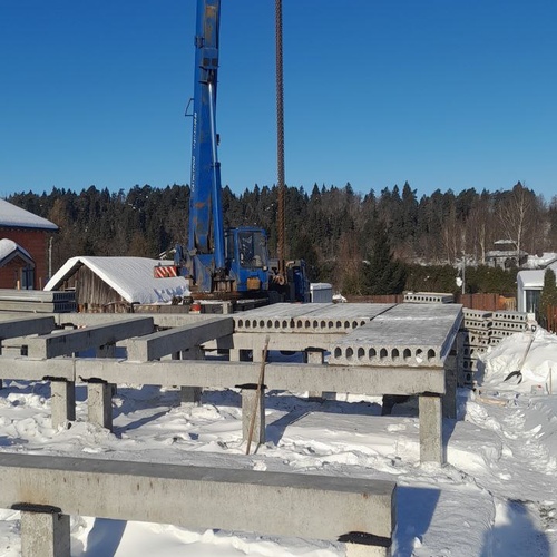 Монтаж свайно-ригельного фундамента в зимнее время на участке со значительным уклоном. Такой фундамент позволяет сэкономить до 50% денежных средств относительно классического монолитного фундамента без потери качества и несущей способности.