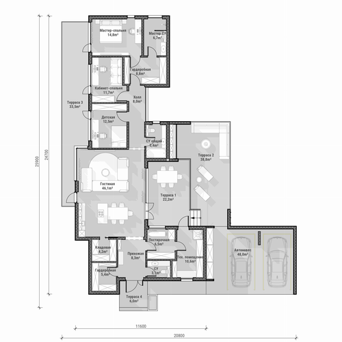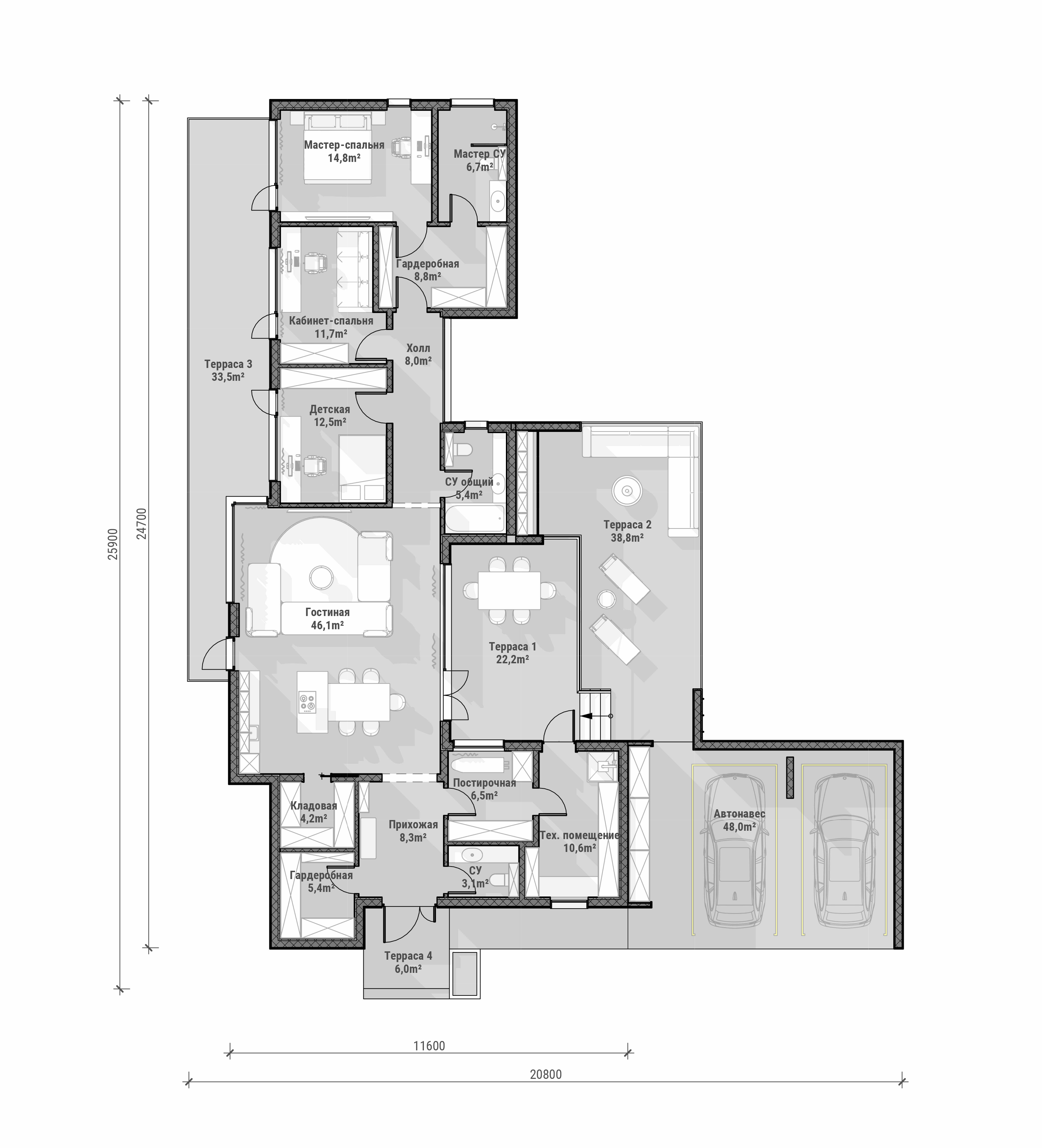 Каждой семье нужны функциональные помещения — и они учтены: прихожая, гардеробная, два санузла, постирочная, кладовая и котельная (10,6 м²). Всё это органично вписано в планировку.