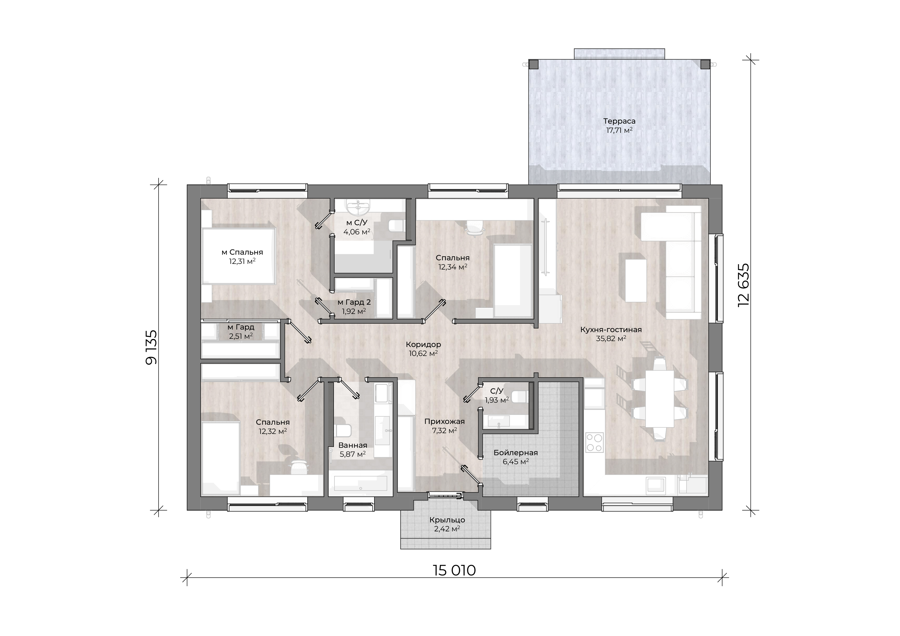 Общая площадь дома — 133 м², габариты — 14,6 × 9,1 м. Такой формат позволяет разместить все необходимые зоны для жизни, сохраняя баланс между компактностью и ощущением простора.
