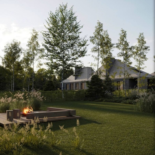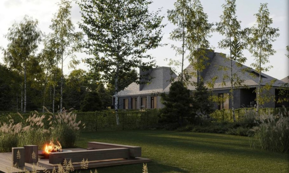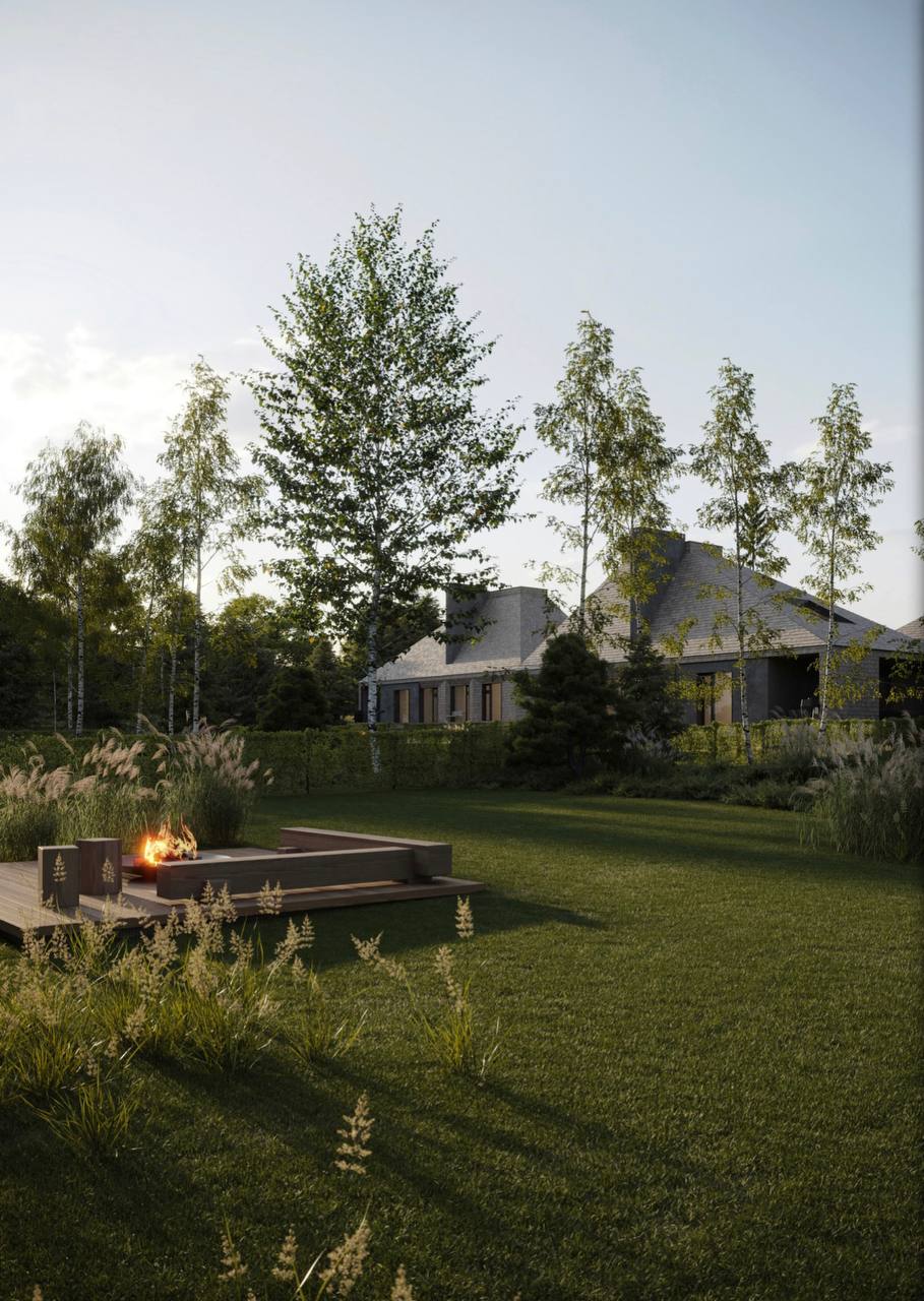 Архитектурный экспонат представляет собой уникальное сочетание современных технологий и природных материалов. Несущий каркас дома выполнен по системе ЛСТК 3.0, гарантирующей высокую прочность, энергоэффективность и быстроту монтажа. Однако подлинную выразительность проекту придаёт наружная облицовка из лиственничной дранки. Этот аутентичный материал, известный своей долговечностью и устойчивостью к влаге, со временем приобретает благородную серебристую патину. Подобный контраст индустриального каркаса и ручной деревянной отделки создаёт запоминающийся визуальный эффект, который непременно привлечёт внимание посетителей выставки и специалистов отрасли. Вся территория домовладения выстроена по концепции белорусской деревни: комплекс включает пять самостоятельных строений, каждое из которых функционирует как отдельный уютный домик. Такая камерная планировка сохраняет приватность и воспроизводит традиционный принцип расселения, где масштаб архитектуры подчинён человеку. Ландшафтное решение органично продолжает заданную тему, но выдержано в стилистике русской деревни. Пространство заполнено декоративными злаками, создающими мягкие сезонные переливы, группами берёз, отсылающими к национальному пейзажному коду, и природными камнями, добавляющими композиции фактурность и основательность. В совокупности инженерные решения, объёмная структура и озеленение формируют целостный образ, где инновации гармонично переплетаются с культурной памятью и природной эстетикой.