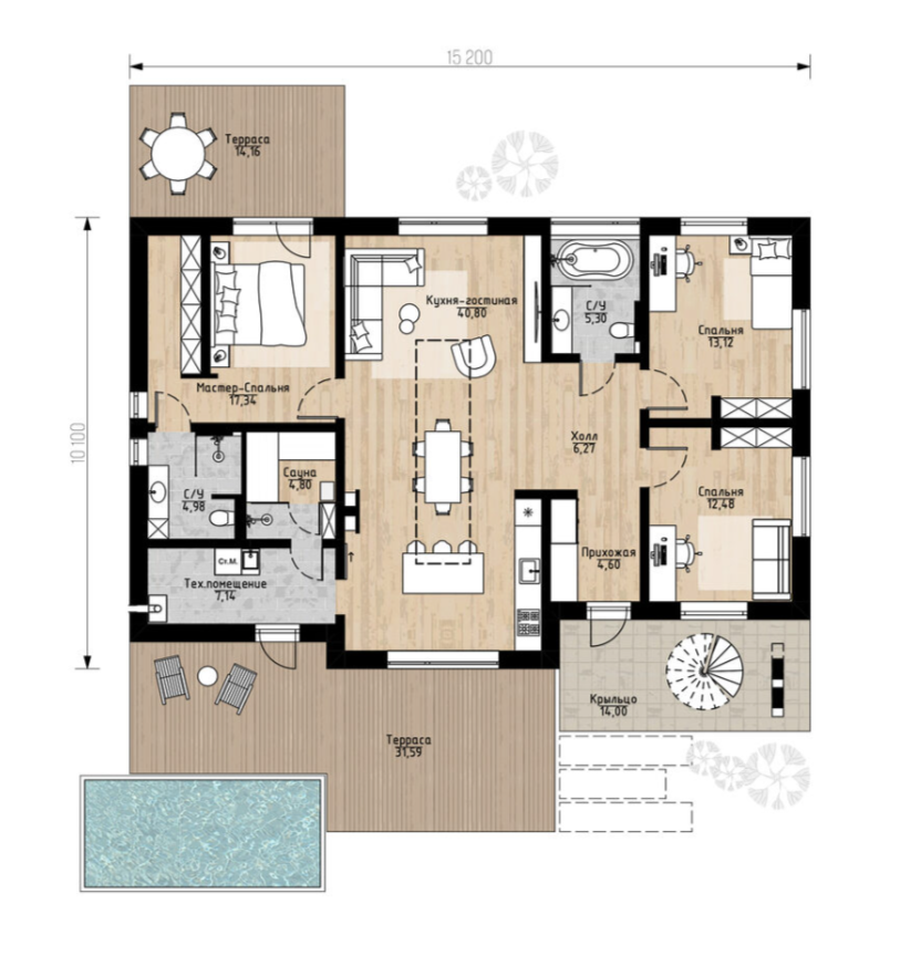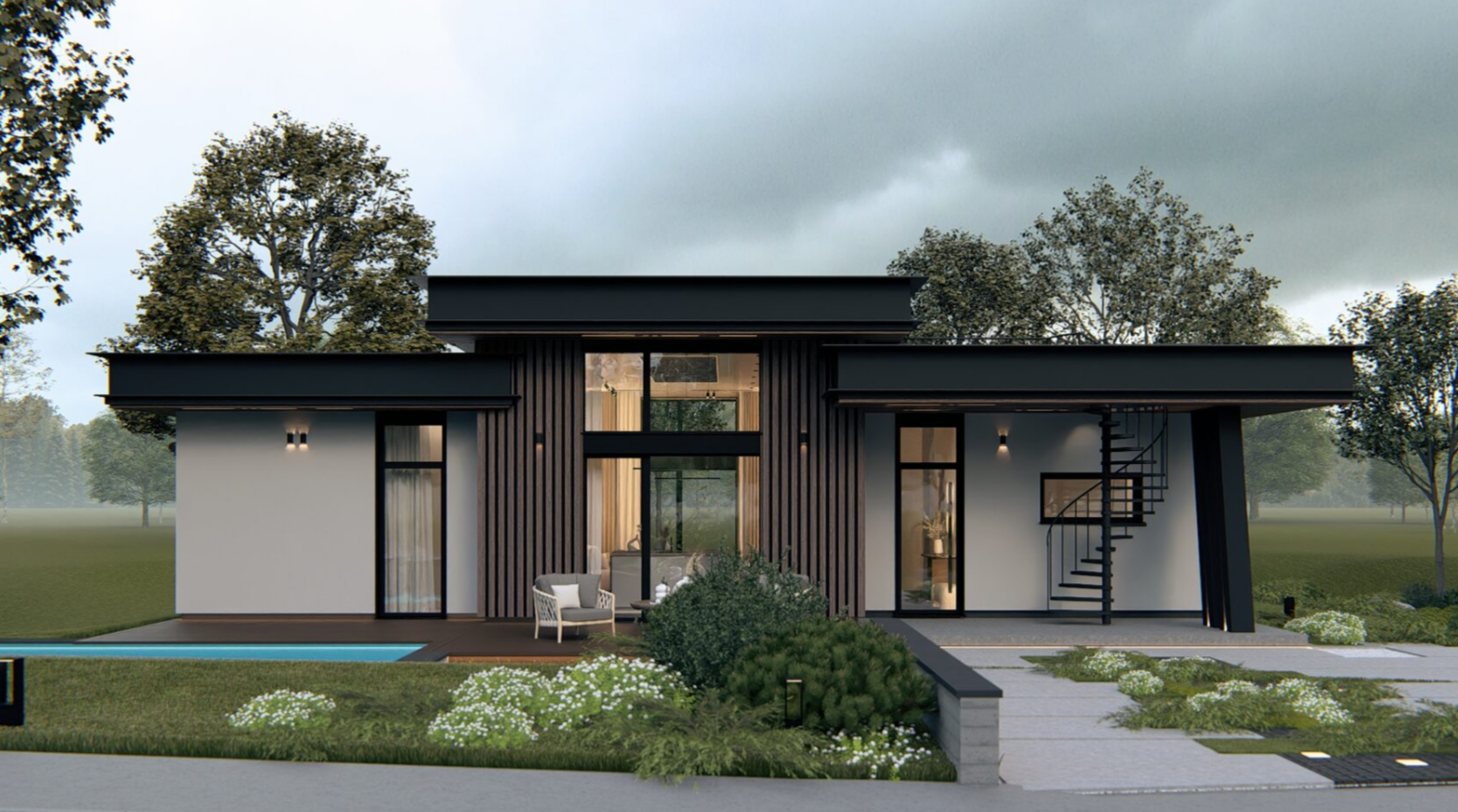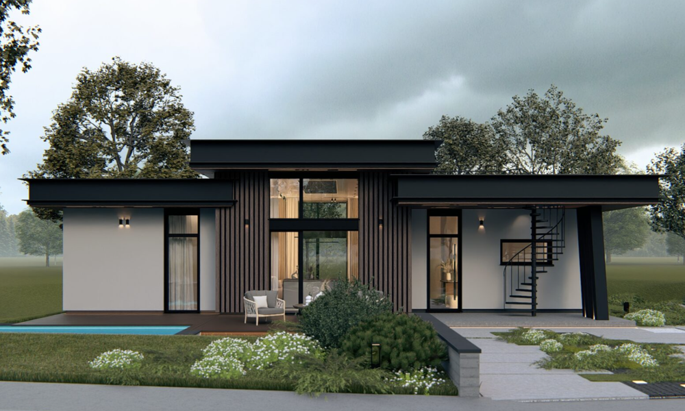 Архитектура здесь – это внимание к деталям. Эксплуатируемая кровля с винтовой лестницей открывает дополнительный уровень с панорамным обзором. Домашняя сауна даёт полноценный отдых без необходимости отдельного банного комплекса.