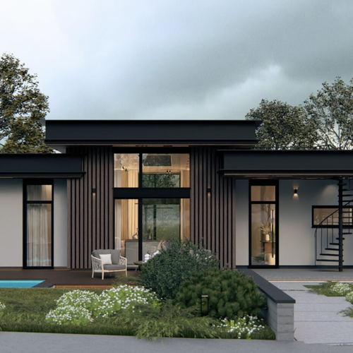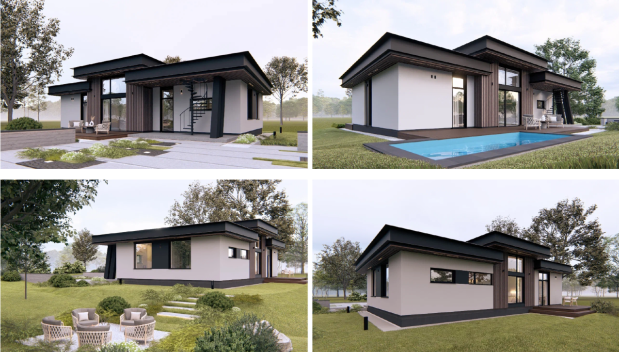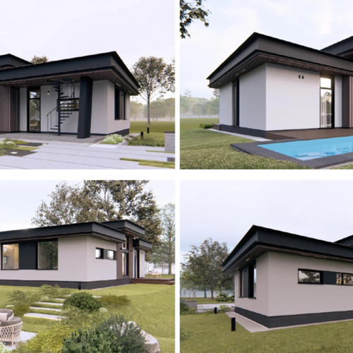 Проект представляет собой компактный одноэтажный жилой дом с выразительным объёмом, сформированным двухуровневой кровлей. Несущие и ограждающие конструкции выполнены из энергоэффективных автоклавных газобетонных блоков.