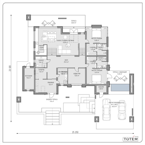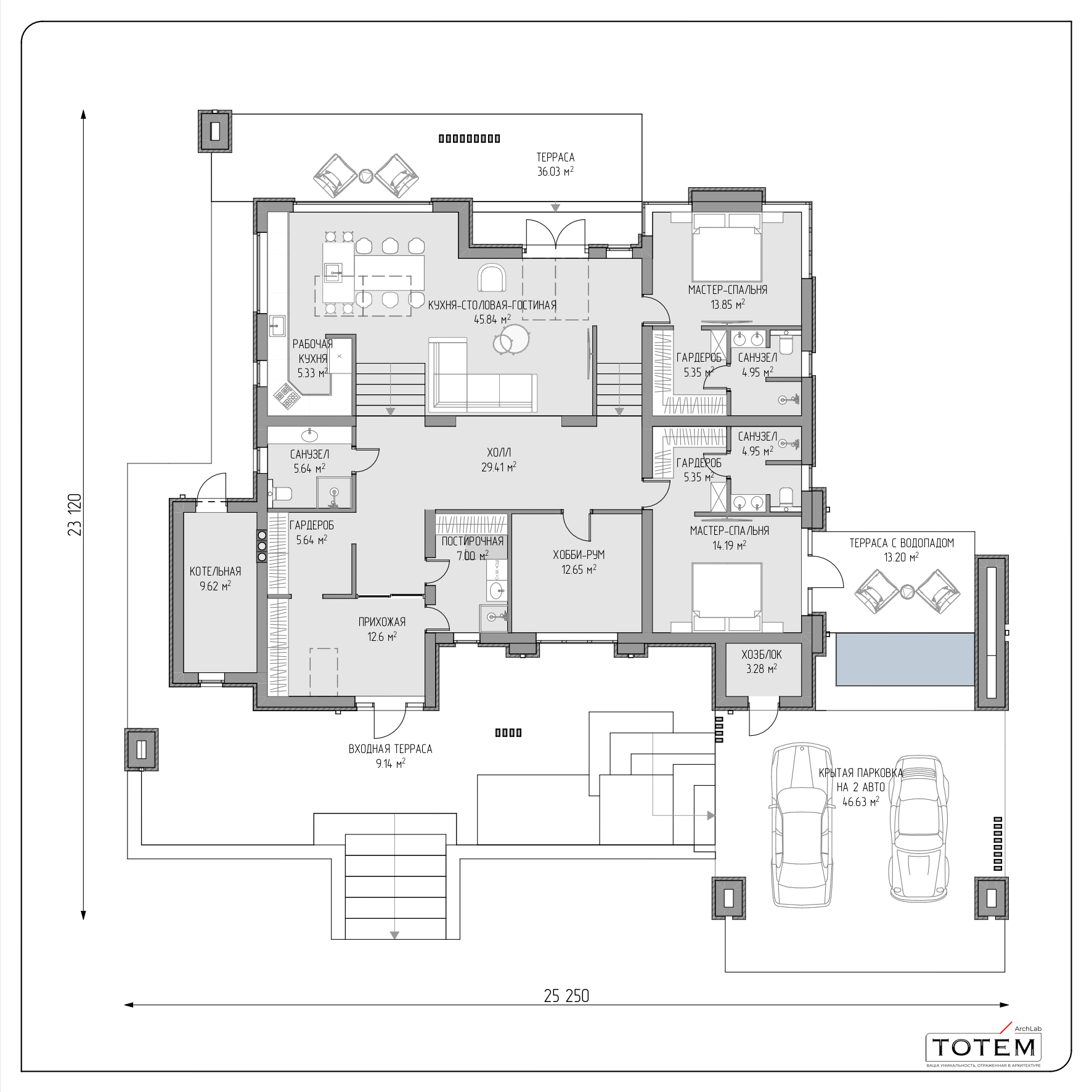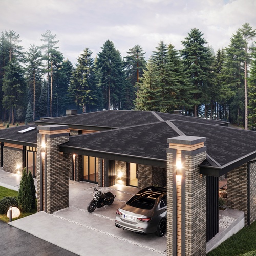 Перед вами одноэтажный дом, который раскрывается как многоуровневое путешествие. Его планировка следует за рельефом участка, создавая два мира: приватный — для восстановления и тишины, и гостевой — для общения, тепла и жизни. Здесь нет случайных решений: каждый шаг логичен, каждое пространство дышит.