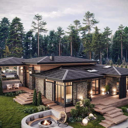Водопад и костровая зона на участке усиливают эффект: вода наполняет, огонь собирает. Это дом, в котором хочется замедлиться, выдохнуть и остаться.