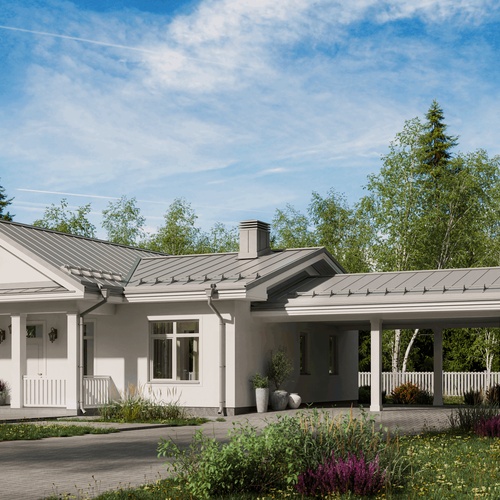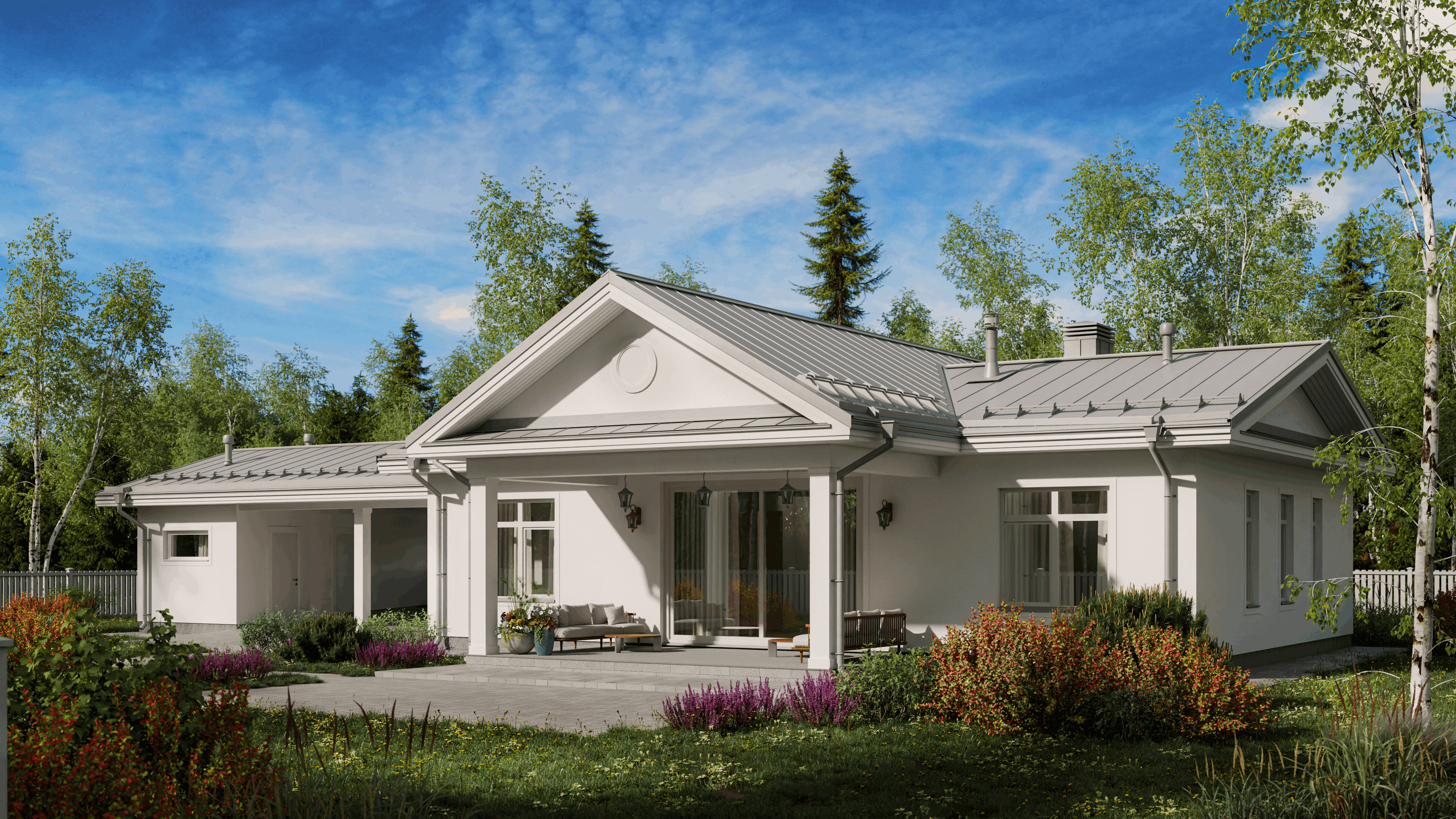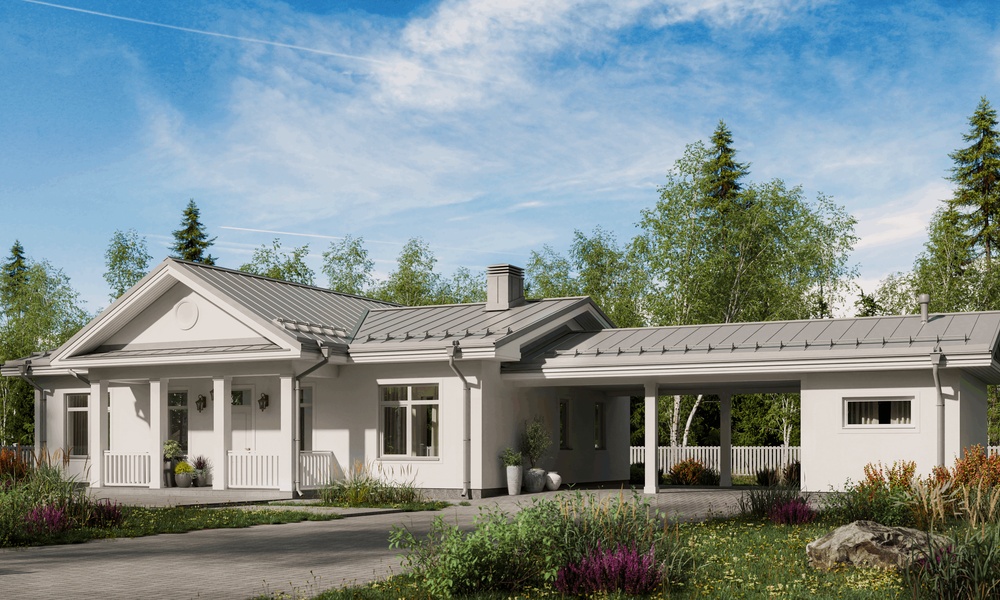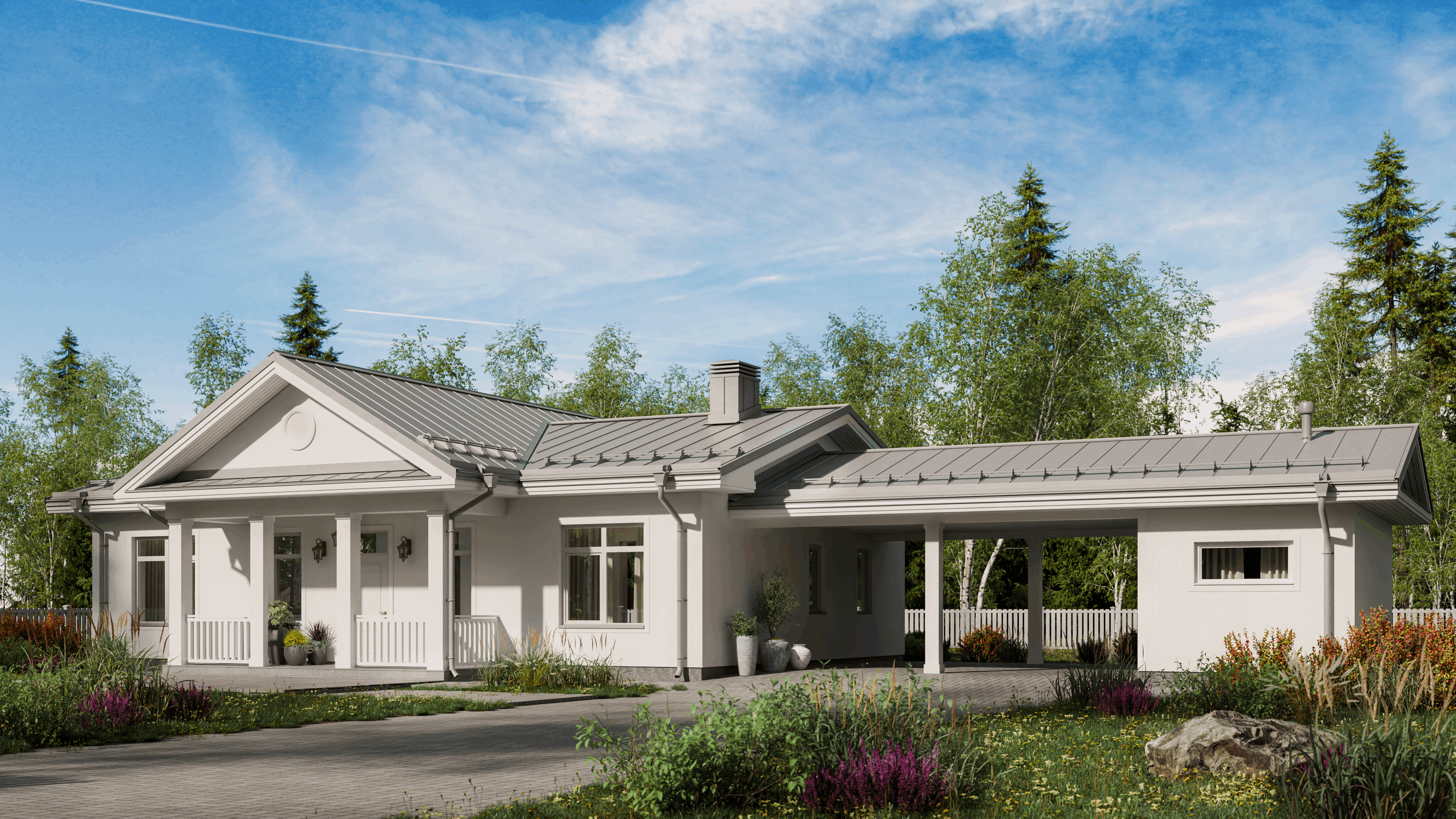 Архитектура дома выстроена на сдержанном контрасте: светлый штукатурный фасад, серая фальцевая кровля, аккуратные фронтоны и колонны у входной группы.