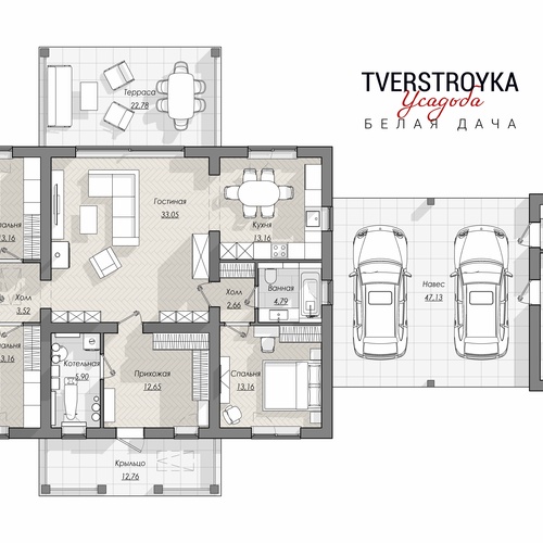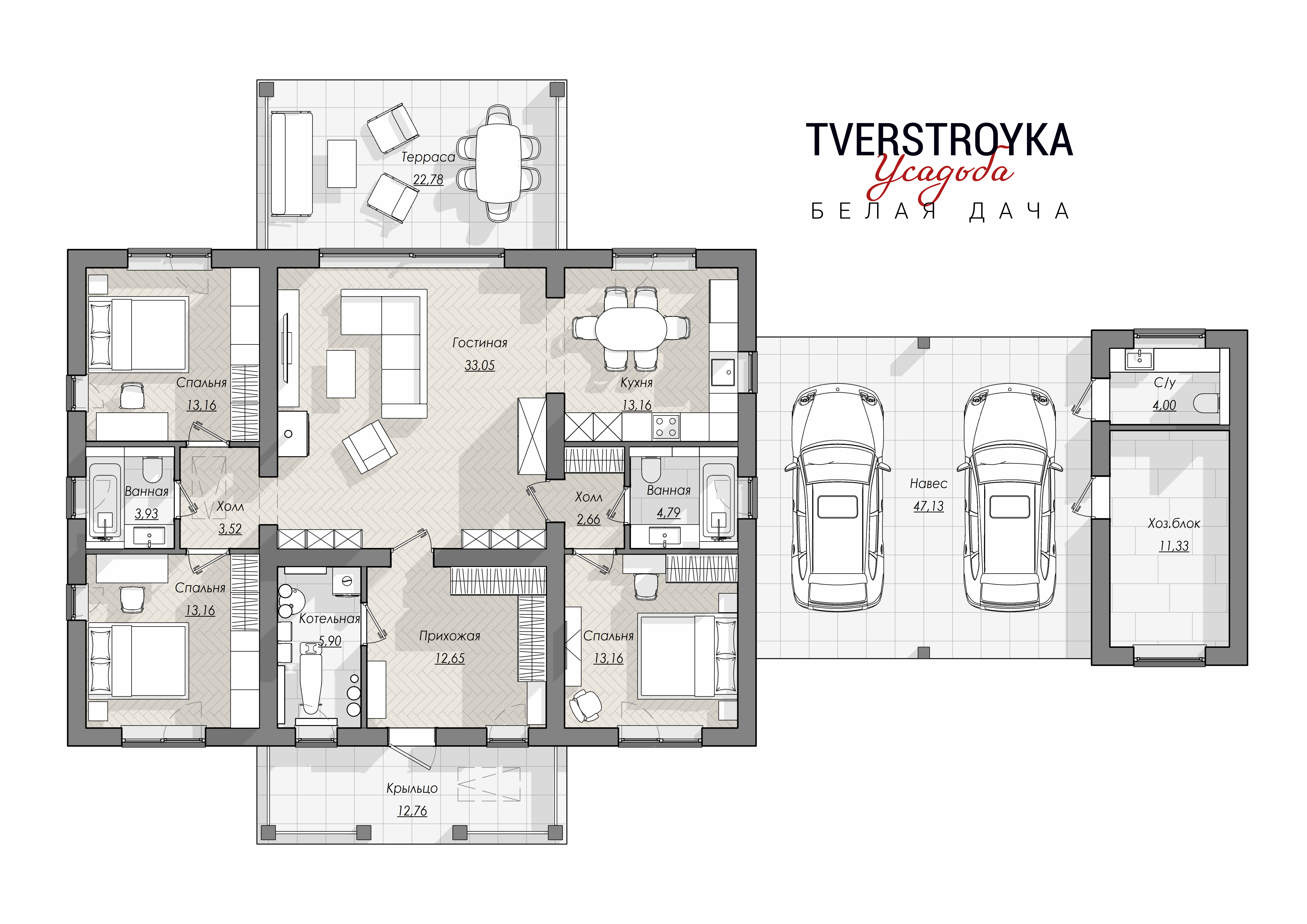 Планировка продумана для комфортной семейной жизни. Центр дома — просторная гостиная 33 м² с отдельной кухней и выходом на террасу 23 м². Три спальни расположены в тихой зоне и изолированы от общих помещений. Вместительная прихожая, два санузла, котельная — всё на своём месте, без компромиссов.