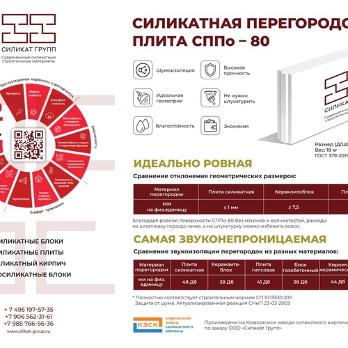 Компания «Силикат Групп» и Ковровский завод силикатного кирпича (КЗСК) запустили производство новой силикатной перегородочной плиты СППо-80 495х80х248 мм марки М-150/200 ГОСТ 379-2015