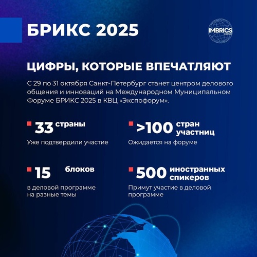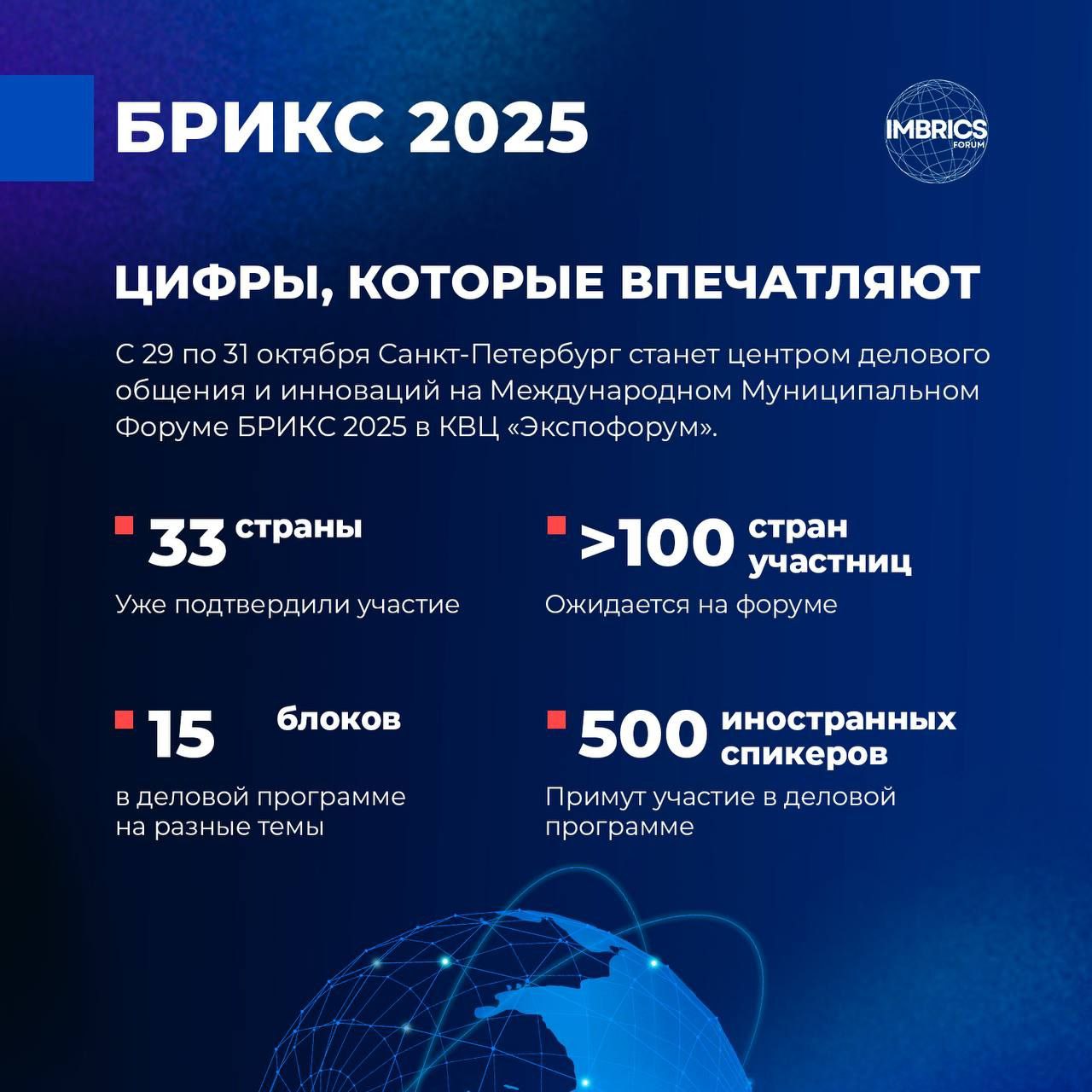 Международный Муниципальный Форум БРИКС 2025 пройдет в Санкт-Петербурге с 29 по 31 октября - одно из ключевых событий в сфере межмуниципального и международного сотрудничества.