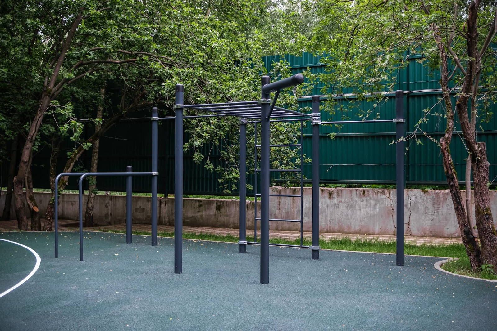 Мы покрасили баскетбольную стойку и воркаут–комплексы в чёрный муар и захромировали хомуты. Осталось уложить резиновое покрытие, но начались заморозки. Резиновое покрытие нельзя укладывать при температуре ниже 7 градусов: клей замёрзнет и покрытие будет крошиться. Согласовали с клиентом перенос укладки на весну и выполнили работы в мае.