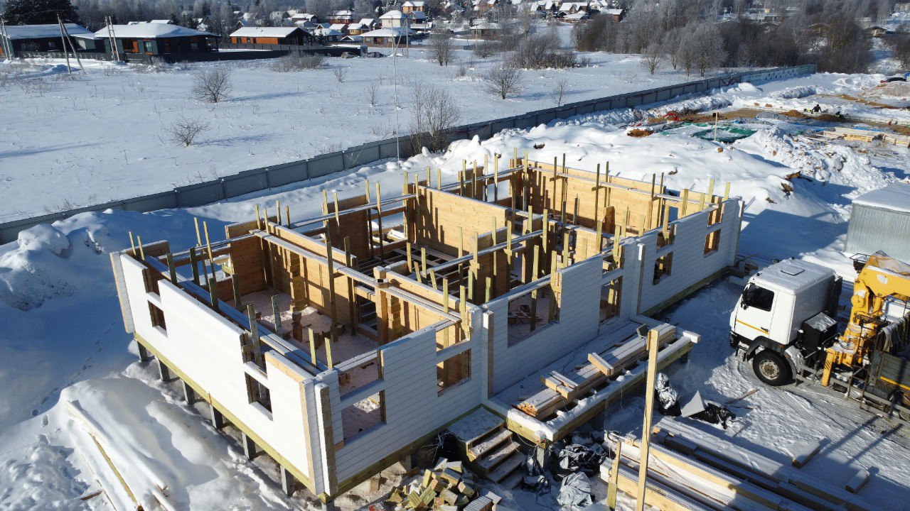 Несмотря на февральские морозы, строительство нашего выставочного дома Сириус 2.0 идёт по графику. Бригады Дом Форест работают в штатном режиме. При минусовых температурах материал остаётся стабильным. За 26 лет работы мы отточили процессы так, что график не зависит от сезона — только от нашего опыта!