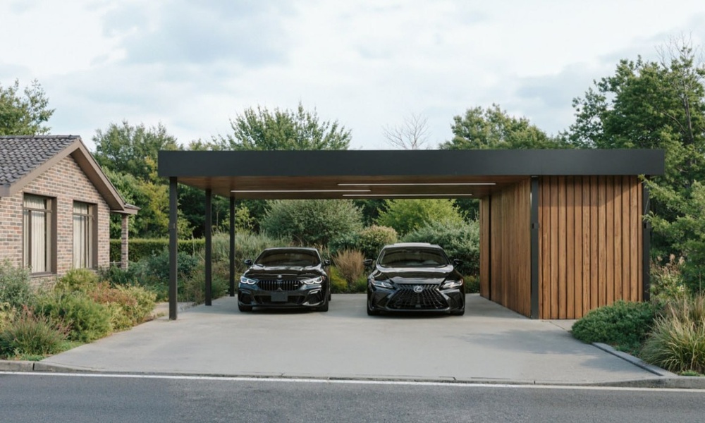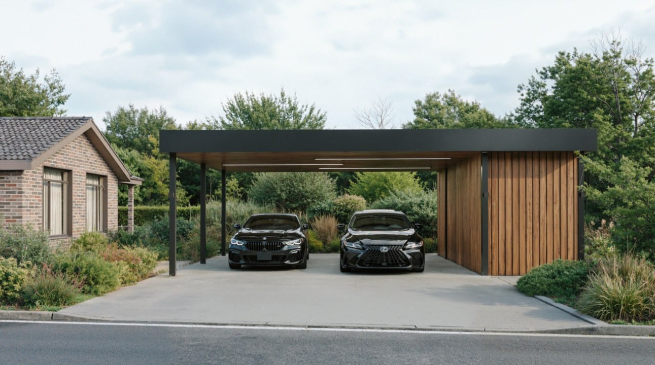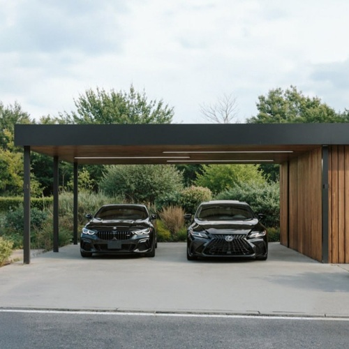 Навес рассчитан на комфортное размещение двух автомобилей с удобными сценариями въезда и выхода. Встроенный хозблок позволяет организовать хранение инвентаря и сезонных вещей, не нарушая визуальную чистоту пространства участка.